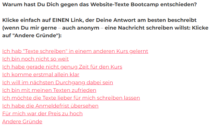 Um das Antworten möglichst leicht zu machen, habe ich den Weg gewählt, Antwortmöglichkeiten vorzuschlagen. So sah das im E-Mail aus: