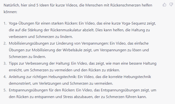 Oder: Sag mir 5 Ideen für kurze Videos, die Menschen mit Rückenschmerzen helfen: