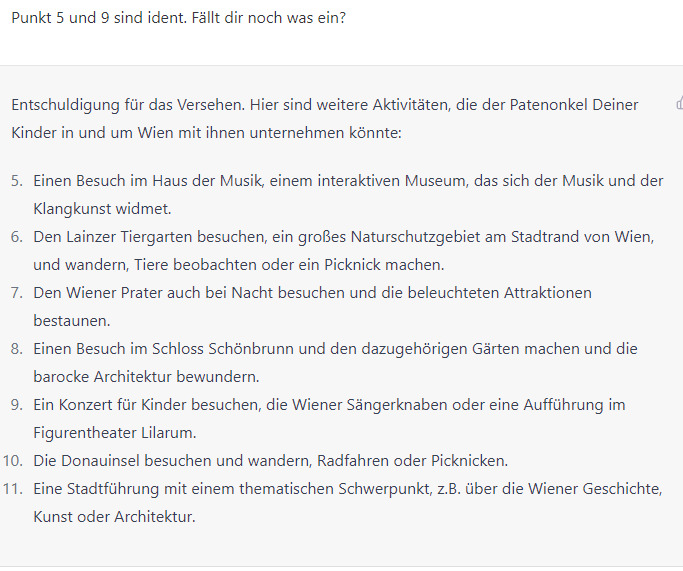 Du siehst, das geht eindeutig schneller als Googeln (wenige Sekunden). Ist aber auch nicht so umfangreich. Außerdem ist Punkt 5 und 9 fast ident. Darauf habe ich ChatGPT hingewiesen und um noch ein paar mehr Ideen gebeten.