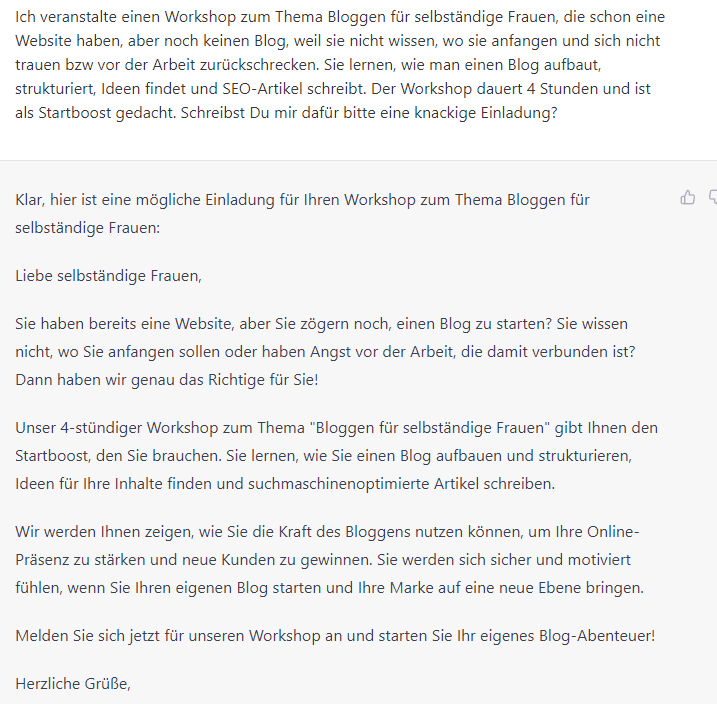 Ich habe ChatGPT zum Beispiel einen Entwurf für die Einladung zu meinem Blog-Workshop schreiben lassen und der KI ein paar Infos gegeben (das hätten ruhig mehr sein dürfen, aber mal als Beispiel):
