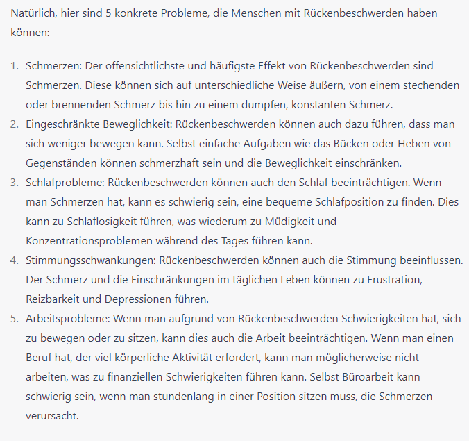 Zum Beispiel: Sag mir 5 konkrete Probleme, die Menschen mit Rückenbeschwerden haben!