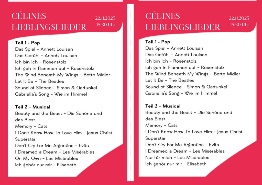 Eigenes Konzert wird es keines geben, aber ich singe in einem französischen Chansons-Konzert mit und in einem Musical-Konzert. Darauf freu ich mich auch schon sehr. Und auf die 2 Generalproben und 8 Vorstellungen von „Nebel„.