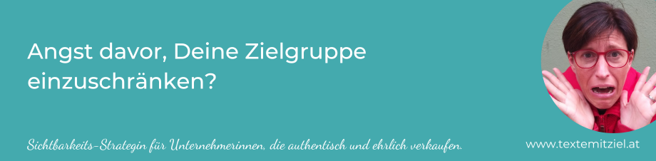Wenn Du jetzt genau wissen möchtest, was Zielgruppe marketing-technisch bedeutet, was ich im Vergleich dazu darunter verstehe und warum ich es für absolut sinnvoll halte, dass Du Deine Lieblingskund:innen genau kennst, beschreiben kannst und einschränkst, lies hier nach: Wer ist meine Zielgruppe?